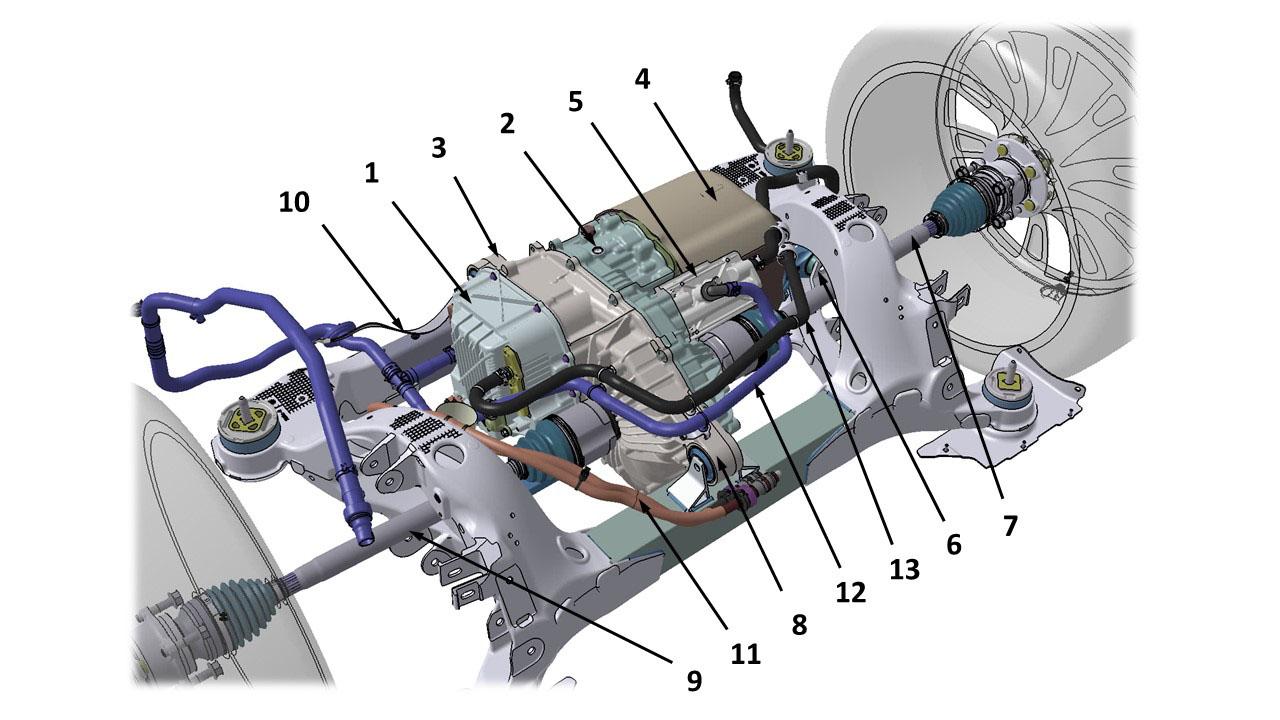 | 1. Drive inverter 2. Gearbox breather 3. Gearbox rear mounting 4. Motor 5. Coolant heat exchanger 6. LH side motor mount 7. Driveshaft LH 8. Gearbox front mounting 9. Driveshaft RH 10. Ground Strap 11. High Voltage cables 12. Coolant inlet 13. Coolant outlet 14. RH Motor Mount 15. Jackshaft |