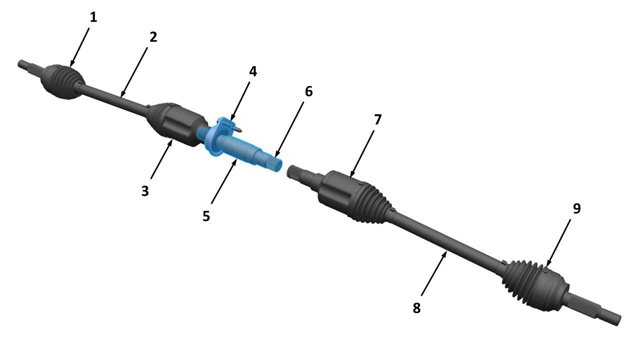 | 1. Outer CV joint 2. RH driveshaft 3. Inner CV joint 4. Jackshaft bearing 5. Jackshaft 6. Differential spline 7. Inner CV joint 8. LH driveshaft 9. Outer CV joint |