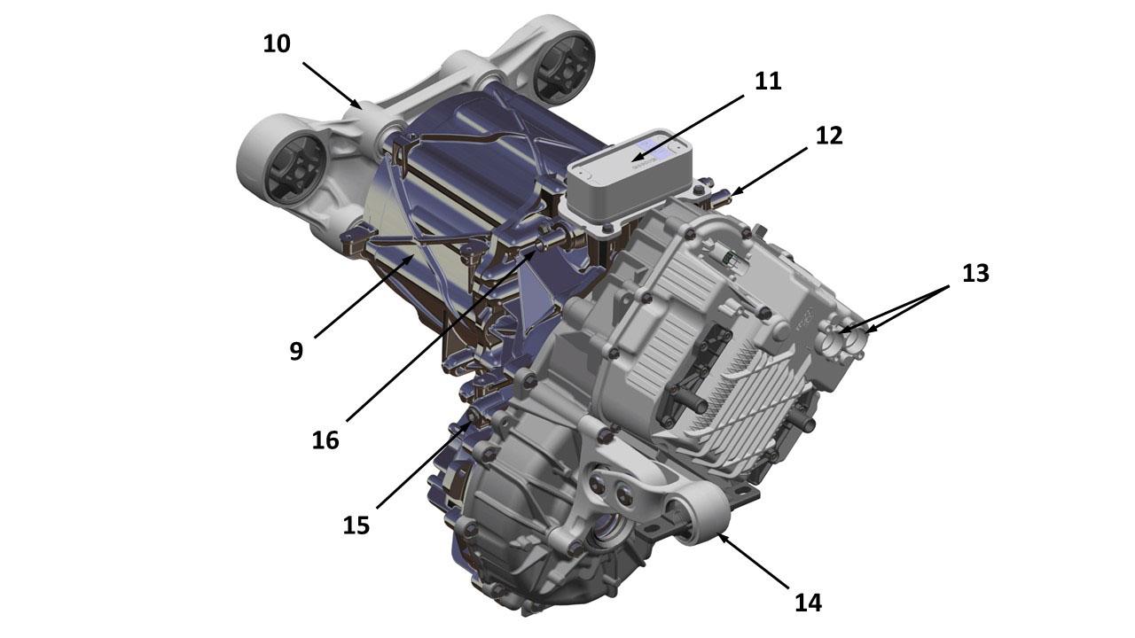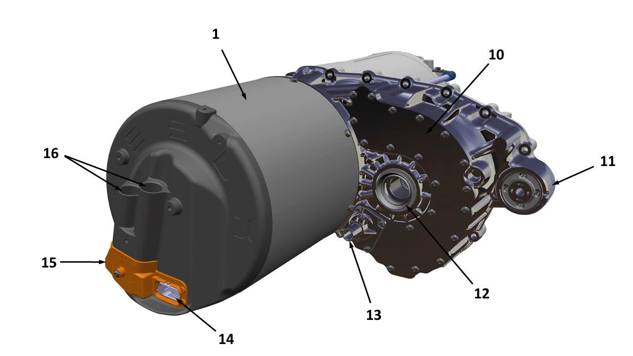 | 1. Drive Inverter 2. Inverter breather 3. Low voltage logic connector 4. Gearbox breather 5. Inverter output busbar cover 6. Inverter coolant inlet 7. Gearbox output LH 8. Inverter coolant outlet 9. Motor 10. Right Motor Mount 11. Heat exchanger 12. Heat exchanger coolant inlet 13. High voltage connectors 14. Left motor mount 15. Gearbox fluid fill plug 16. Heat exchanger coolant outlet |