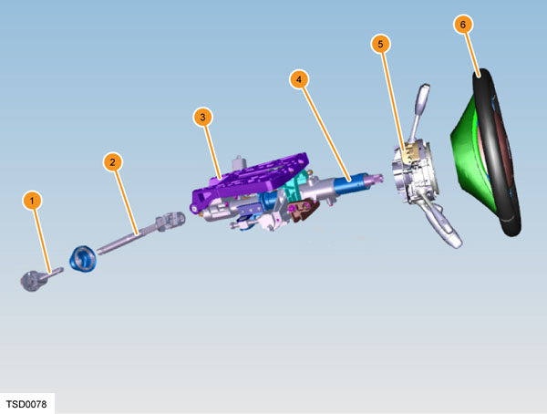 | 1. Intermediate link - lower 2. Intermediate link - upper 3. Sliding carrier 4. Steering column 5. Steering column control module (SCCM) 6. Steering wheel |