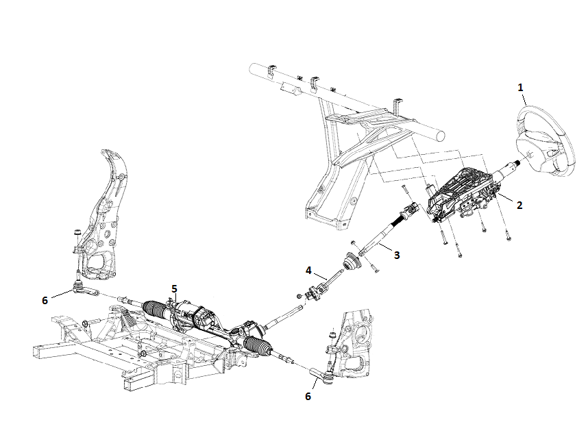 | 1. Steering wheel 2. Steering column assembly 3. Upper i-Shaft 4. Lower i-Shaft 5. Steering Gear 6. Tie Rod |