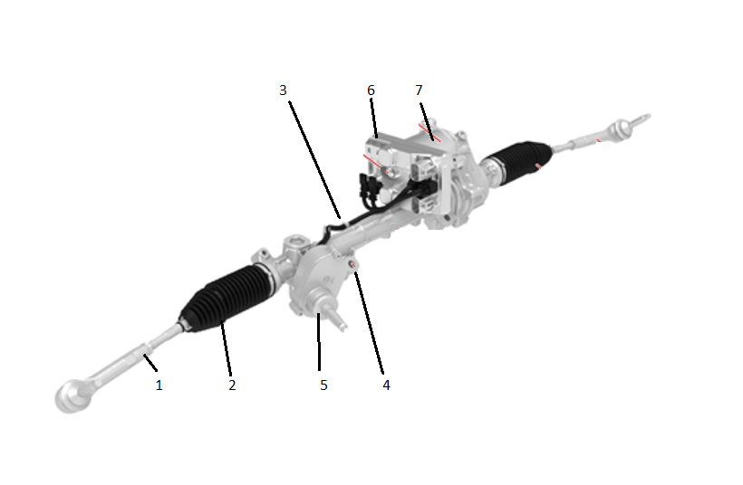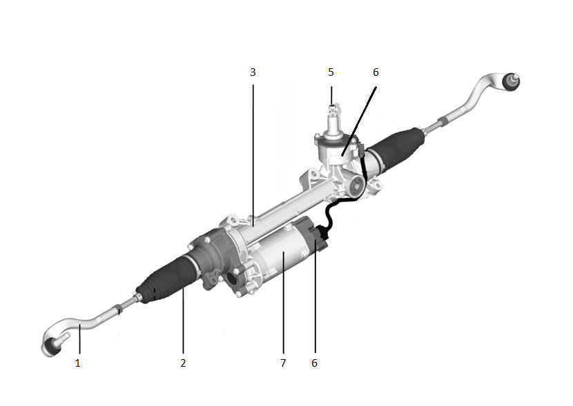 | 1. Outer Tie Rod 2. Inner Tie Rod (inside rubber bellows) 3. Steering Gear 4. Torque Sensor 5. Input Shaft 6. ECU 7. Motor |