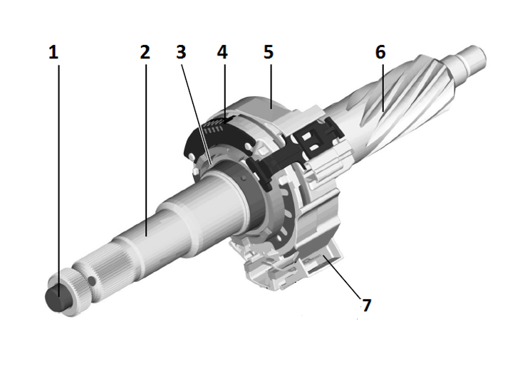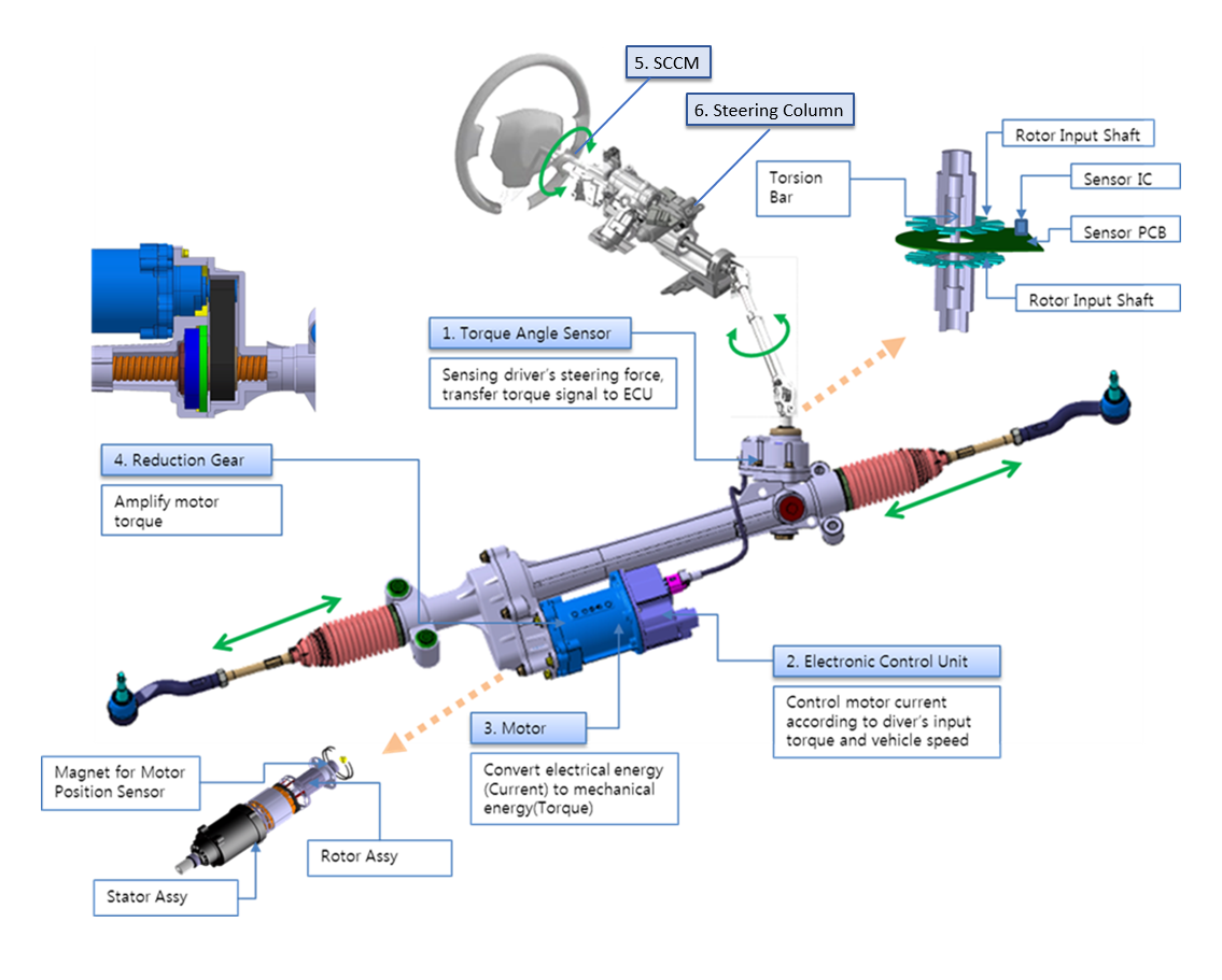| 1. Torsion Bar 2. Steering Input Shaft 3. Magnet Ring 4. Sensor Module 5. Clock Spring 6. Steering Pinion 7. Electrical Connector |