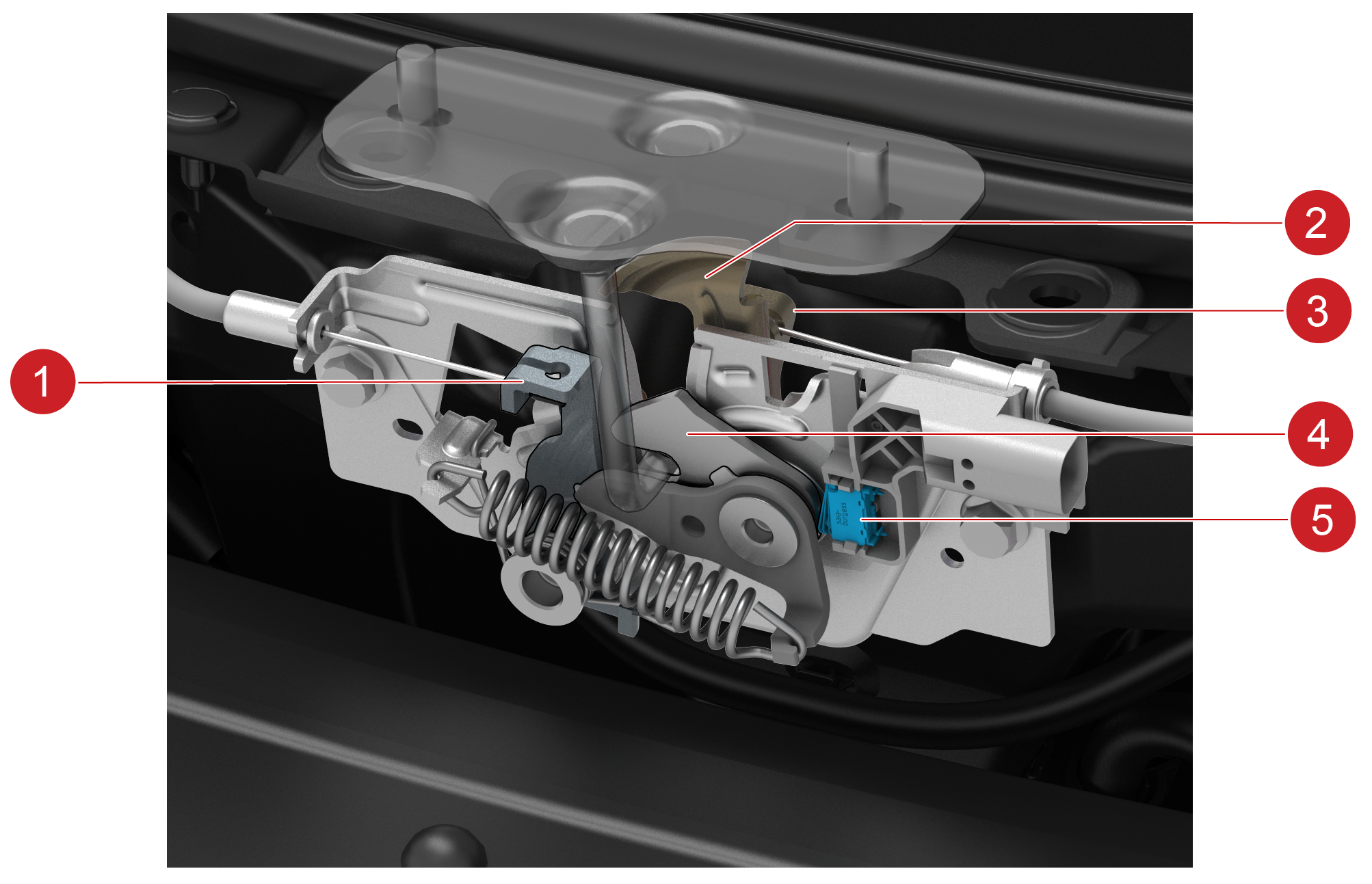 | 1. Primary Pawl 2. Secondary Catch/Hook 3. Secondary Pawl 4. Primary Claw 5. Latch engagement micro-switch |