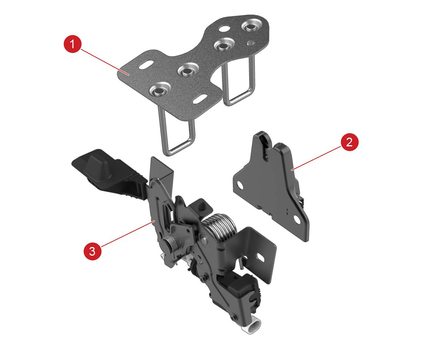 | 1. Hood striker 2. Hood latch 3. Hood secondary catch |