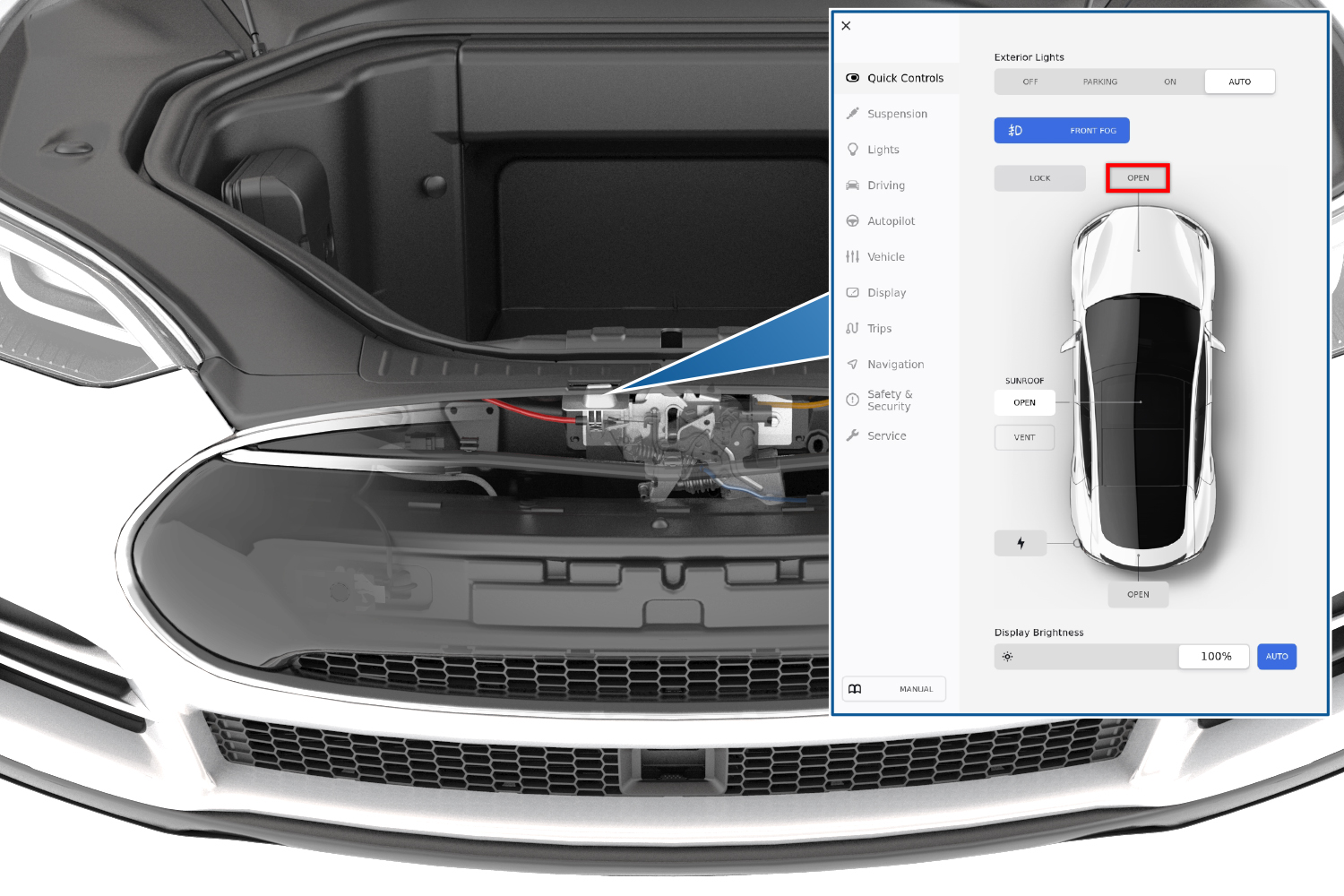 - Touch CONTROLS > FRONT TRUNK on the touchscreen.