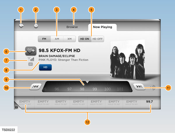 | 1. Favorites 2. Recently played 3. Radio source 4. Browse 5. HD radio ON/OFF 6. Add/delete favorite 7. Signal strength indicator 8. Station information 9. Station frequency/channel selector 10. Previous station/channel 11. Next station/channel 12. Presets |