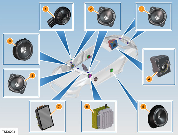 | 1. ‘A’ post tweeter 2. Dashboard Speakers (premium) 3. Liftgate speakers (premium) 4. Subwoofer (premium) 5. Rear door speakers 6. Tuner (premium adds XM antenna jack) 7. Touchscreen/media control unit 8. Dashboard Speaker 9. Front door speakers (premium) |