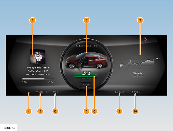 | 1. Left information display - configurable 2. Vehicle status overview 3. Right information display - configurable 4. Door lock status 5. Odometer 6. Outside temperature 7. Accessory mode indicator 8. Battery charge indicator 9. Date 10. Time |