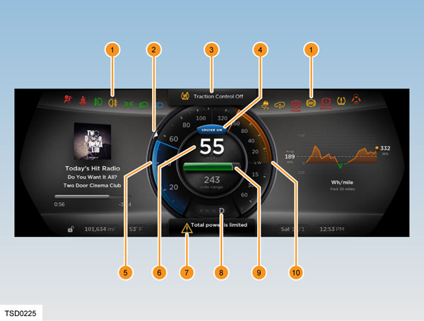 | 1. Indicator lights 2. Cruise control set speed indicator 3. Traction control off 4. Cruise control on 5. Speedometer 6. Current speed 7. System warning messages 8. Gear selected 9. Battery charge indicator 10. Power meter |