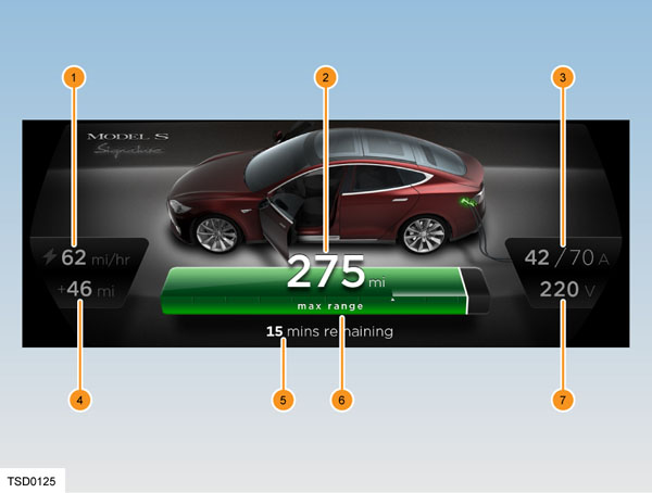 | 1. Charging rate per hour 2. Vehicle range based on charge level 3. Charging current/Maximum current available from connected supply 4. Range increase this charging session 5. Time remaining until charged 6. Charge level 7. Voltage of connected supply |
