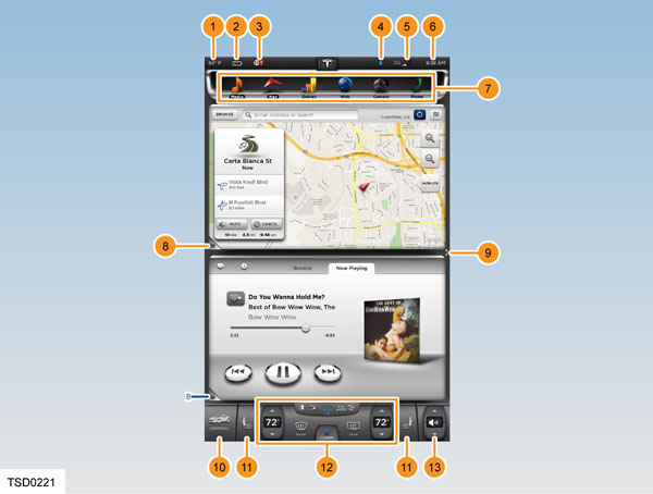 | 1. External temperature 2. Battery charge level 3. Vehicle alert notification 4. Bluetooth® connection indicator 5. Vehicle 3G GSM signal strength indicator 6. Clock 7. Applications 8. Maximize/minimize application 9. Change application position 10. CONTROLS 11. Seat heaters 12. Heating and ventilation controls 13. Volume control |