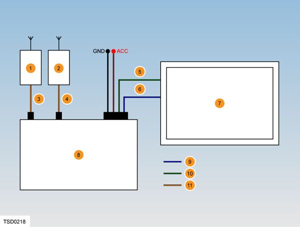 | 1. Power antenna box 2. Power antenna box 3. Sub. ANT 4. Main ANT 5. Audio FR/FL 6. CAN 7. Media Control Unit with 17" touchscreen 8. Tuner module 9. Twisted pair with shield connected at tuner module 10. Twisted pair with shield connected at tuner module 11. Coax cable |