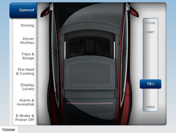 Sunroof operation is controlled through the touchscreen, and the roof can be partially or fully opened or tilted.