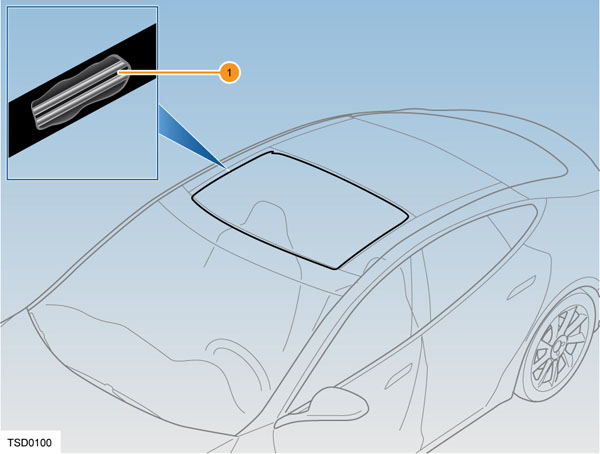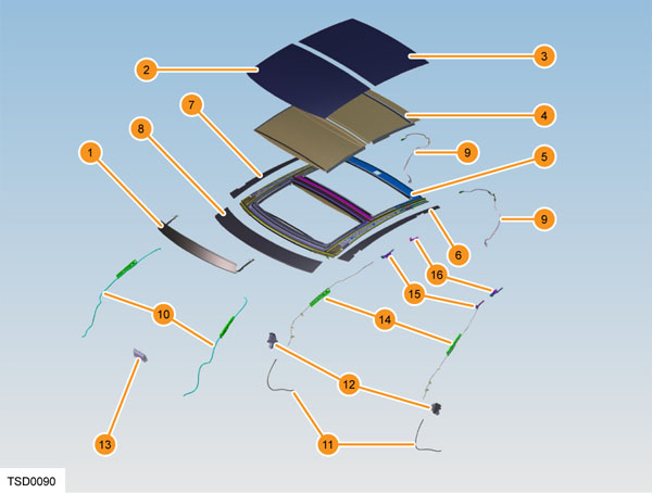 | 1. Wind deflector 2. Sliding glass panel 3. Fixed glass panel 4. Sunshade 5. Frame 6. Side appliqué - LH 7. Side appliqué - RH 8. Front appliqué 9. Front drain tubes 10. Return tubes for drive cable 11. Motor and mounting plate 12. Sunroof Electronic Control Unit (ECU) 13. Drive cables 14. Rear mechanism link LH/RH 15. Front mechanism link LH/RH |
