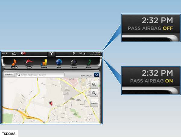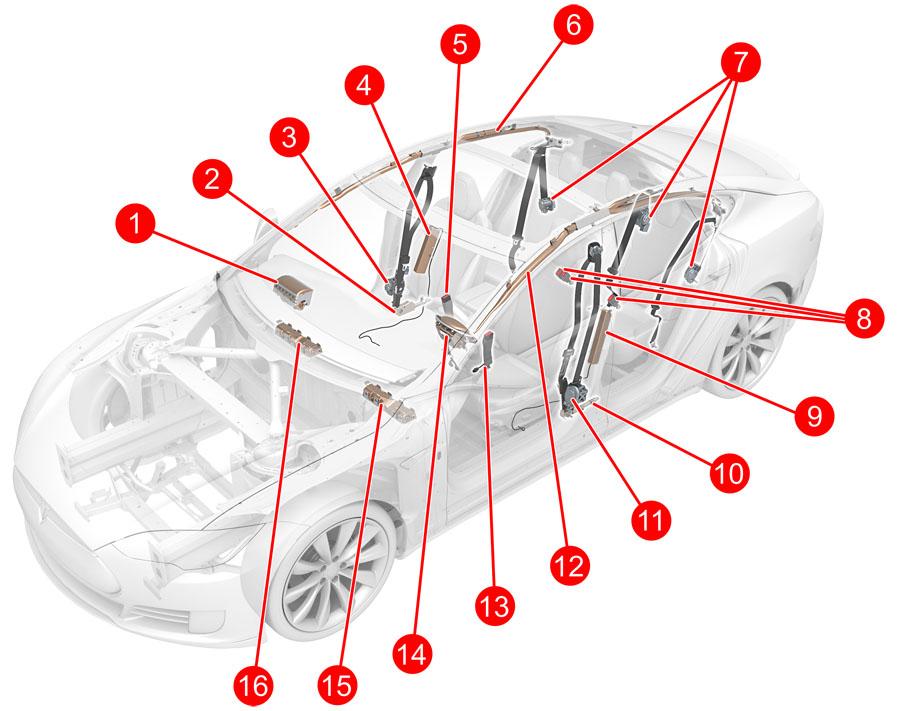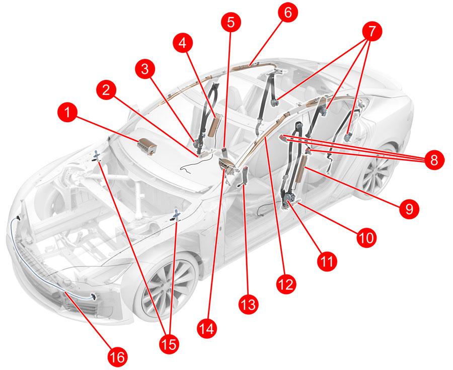 Model S is equipped with a Tesla Supplementary Restraint System (TSRS). The system is comprised of the following components: