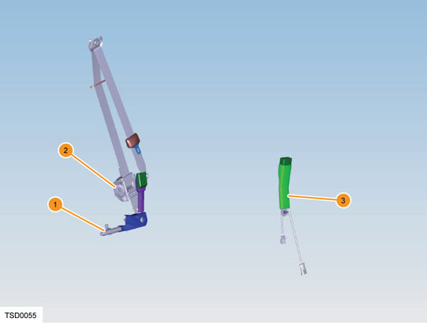 | 1. Lap belt pretensioner 2. Shoulder belt retractor and pretensioner 3. Seat belt buckle |