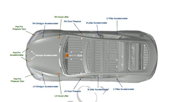 - ‘B’ pillar sensors (x2) - accelerometers (for vehicles without Pedestrian Protection)