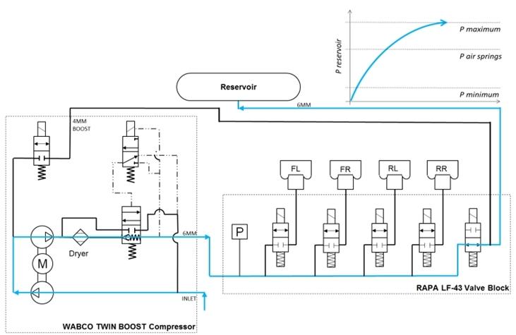 The reservoir stores pressurized air for the system to use at a later time. This allows the compressor to run at different times from raising or operations. For example, the reservoir can provide pressurized air to raise an air spring, but the compressor will fill the reservoir at a high speed where the user may not notice it. The reservoir has a maximum volume capacity of 5.2 liters and has a maximum operation pressure of 18 bar (261 psi).