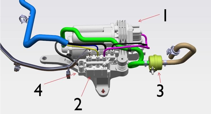 | Compressor / Valve block top view 1. Air compressor 2. Solenoid Valve Block 3. Air Filter 4. 2 Electrical connectors - 10 Pin for Solenoid Valve Block and 2 Pin for Air Compressor (not shown in above picture) |