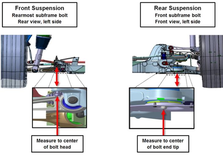 Physically measure the actual ride height between the ground (4-post lift) and the bottom of the chassis at pre-selected points (see figure below). These heights should be entered in Toolbox.