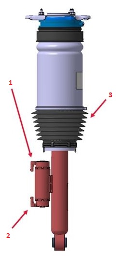 | Adaptive Front Air Spring 1. Compression solenoid valve 2. Rebound solenoid valve 3. External gas reservoir |