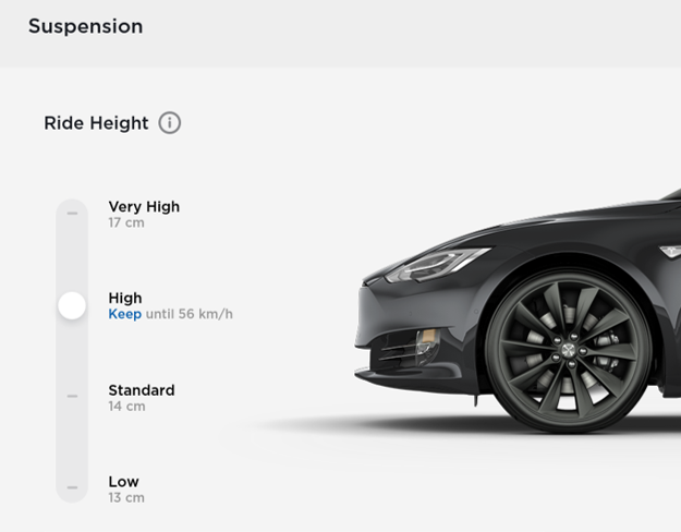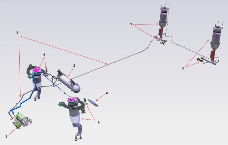 | Tesla Air Suspension System 1. Air Compressor Assembly (including Solenoid Valve Block, Air Filter and Ambient Temperature Sensor) 2. Reservoir 3. Air supply pipes 4. Air suspension Electronic Control Unit 5. Left-hand Front Suspension Module and Height Sensor 6. Right-hand Front Suspension Module and Height Sensor 7. Right-hand Rear Suspension Module and Height Sensor 8. Left-hand Rear Suspension Module and Height Sensor |