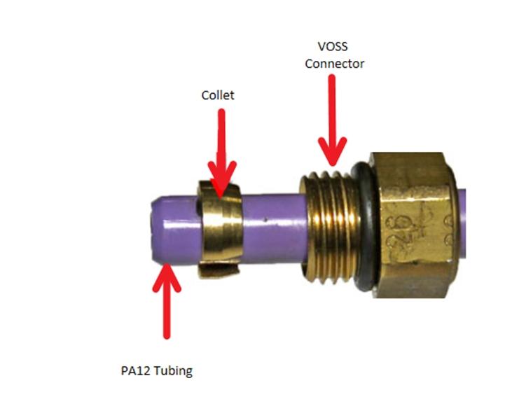 Try not to install a VOSS fitting into a component with the air line still attached as it is very easy to cross-thread the thread on the component. If possible, install a new VOSS fitting first and then insert the air line.