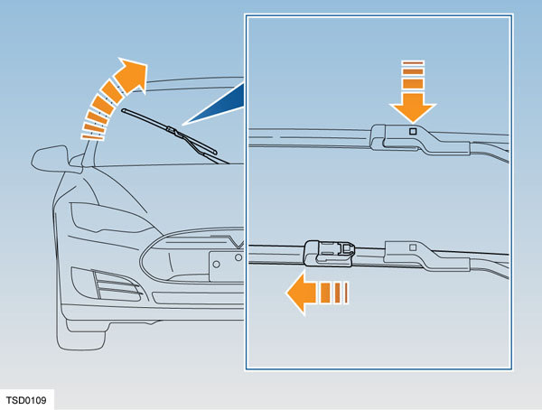 Each wiper blade is secured to its arm using a spring-mounted locking tab. Press the tab and slide the blade down the arm to remove it.