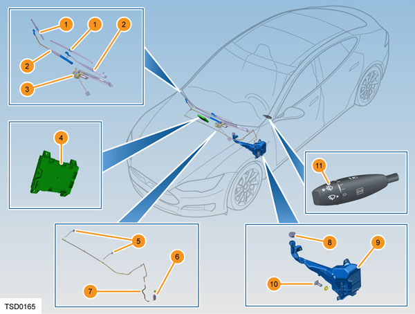 | 1. Windshield wiper blade 2. Windshield wiper arm 3. Windshield wiper motor and linkage 4. Body control module 5. Windshield washer jets 6. Windshield washer pump 7. Windshield washer tube 8. Windshield washer reservoir cap 9. Windshield washer reservoir 10. Windshield washer fluid level sensor 11. Windshield wiper and washer switch |
