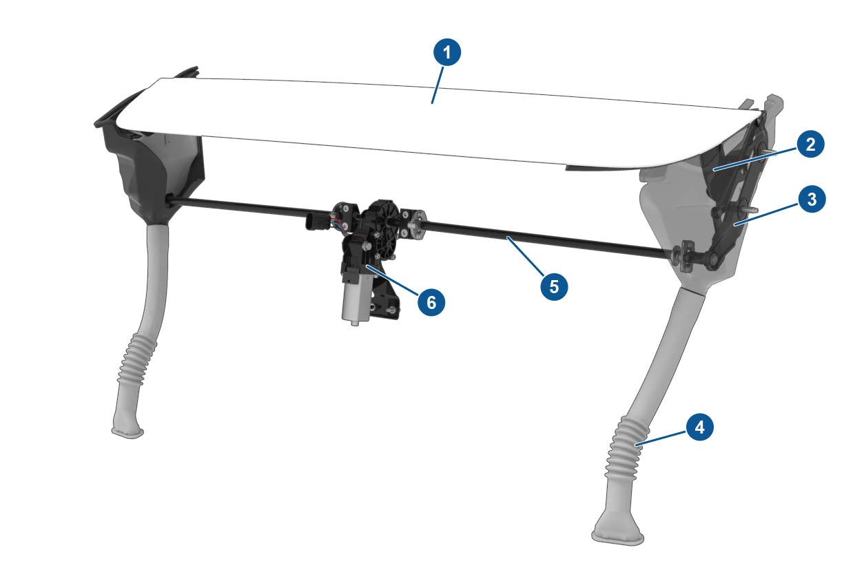 | 1. Active spoiler assembly 2. Stanchion (x2) 3. Hinge (x2) 4. Drain hose (x2) 5. Torque Rod (x2) 6. Motor |
