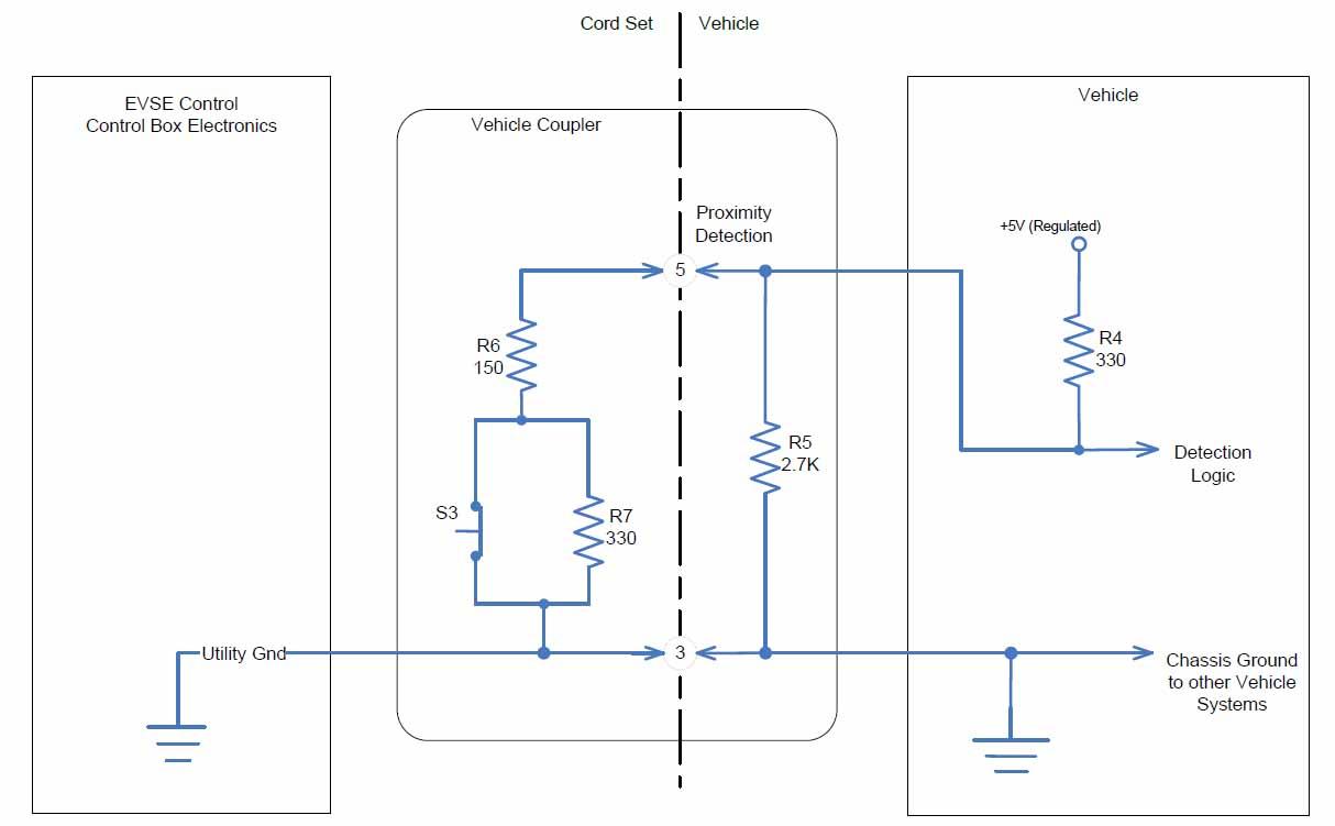 In the “Not Connected” state, the proximity voltage is approximately 4.5V. In the “Connected” state, switch S3 is closed and the proximity voltage is approximately 1.5V. In the “Button Pressed” state, switch S3 is open and the proximity voltage is 2.8V. The proximity circuit connects to the on-board charger where voltage is monitored and interpreted.