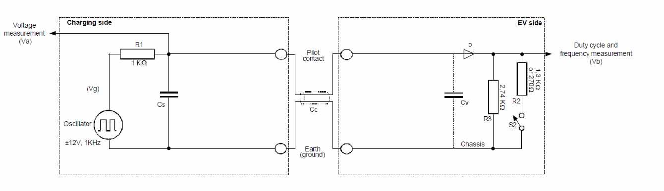 The control pilot (CP) signal is generated by the EVSE to tell the vehicle the maximum AC line current it is allowed to draw. The pilot signal is transmitted as a low voltage (max ± 12V) pulse width modulation (PWM) voltage signal sent through a single wire available in any modern charge cable. The duty cycle of the PWM tells the charger the exact current limit of the supply. This is standardized internationally in IEC 61851-1 and SAE J1772. The vehicle charger includes a switch (called S2) which the vehicle uses to request the charge equipment’s switching device to close, and thus allow the vehicle to draw current.