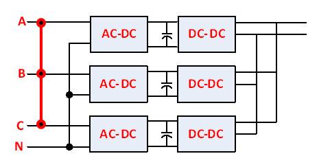 Although the phase boards are identical across the three-phase and single-phase versions of the charger, the routing of the incoming AC wires is different. The three-phase version connects each incoming phase to one phase board, and connects the neutral to all three-phase boards. The single-phase version connects all three-phase boards in parallel to phase and neutral. See the diagram below.