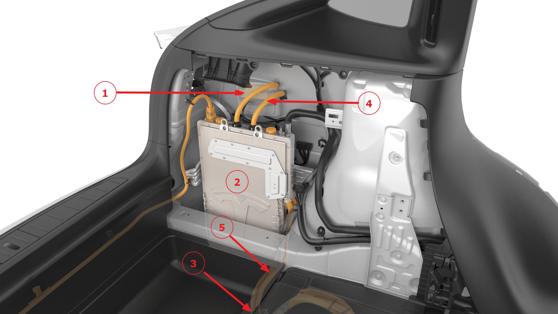 | 1. Charge Port 2. Charger 3. Rapid Splitter 4. HV cables between Charge Port and Charger (x2 in North America, x4 in EMEA/APAC) 5. HV cables between Rapid Splitter and Charger |