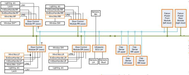 All controllers on the Rear Door Control CAN Bus have unswitched 12V power, except for the Ultrasonice ECU. The Ultrasonic ECU receives its power from the Rear Driver Door Control Module.