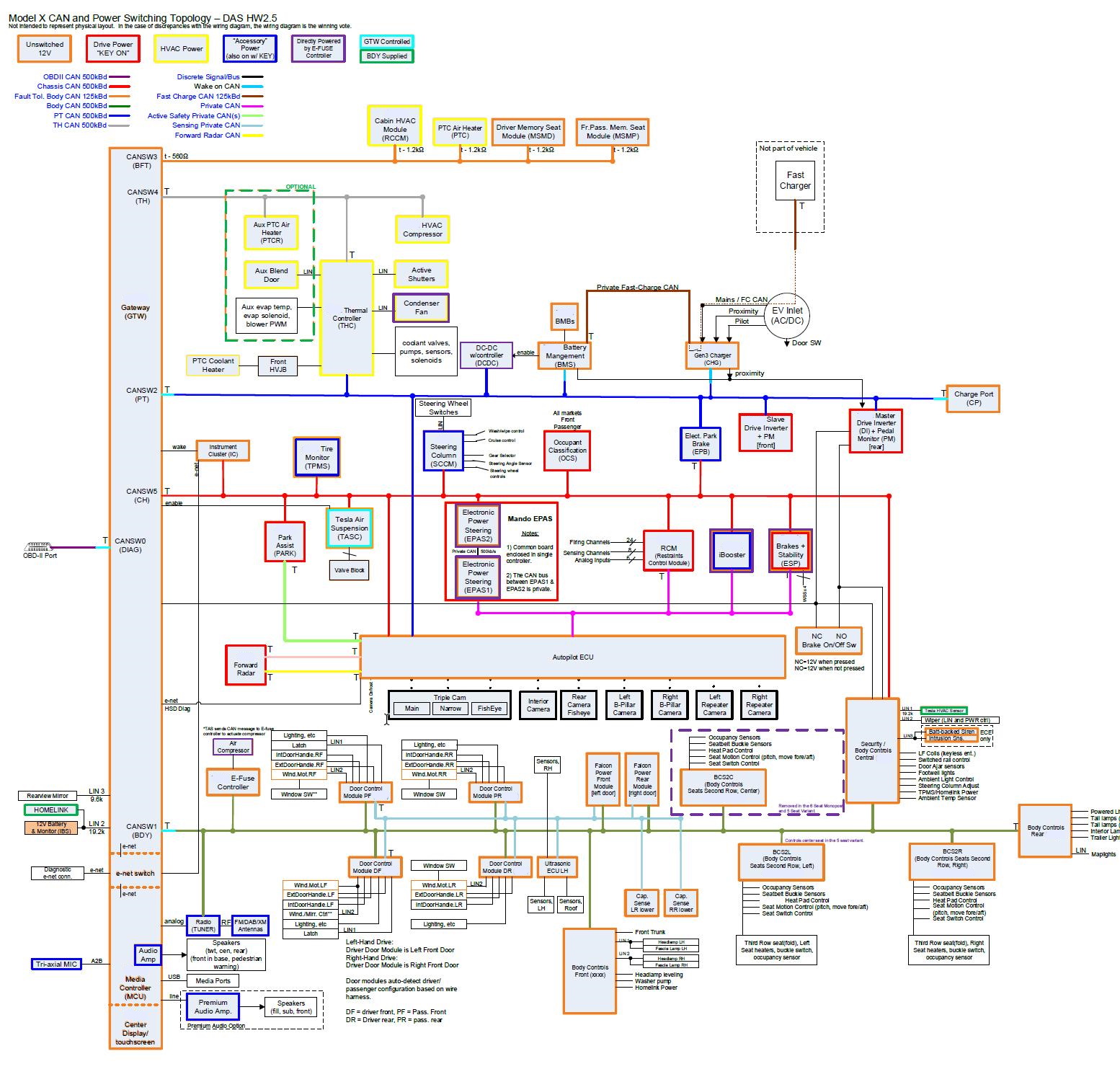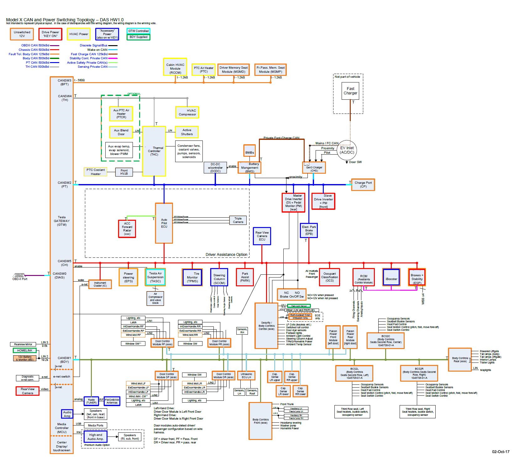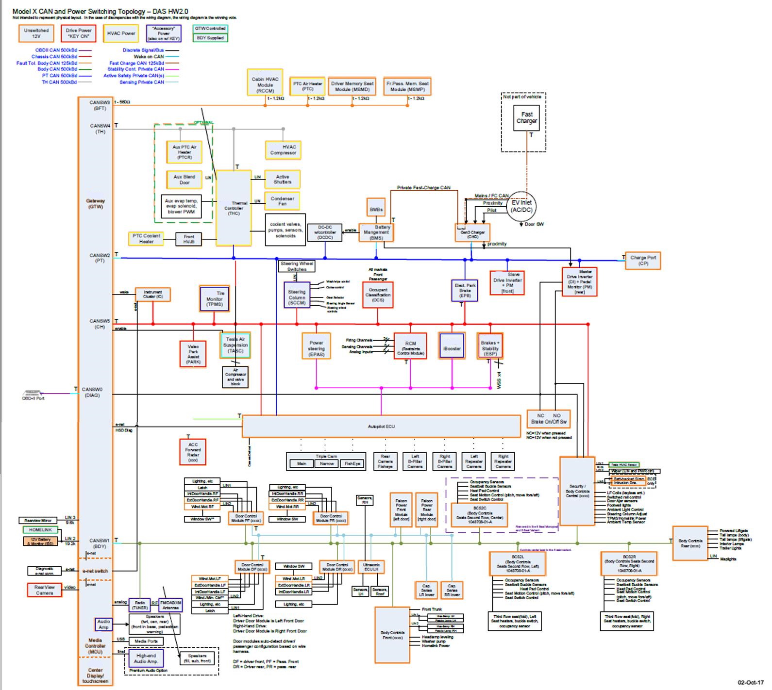 Model X has a total of 10 Controller Area Network (CAN) buses. Of the 10 CAN buses, 6 are connected to the Tesla Gateway (GTW). The other buses are considered private CAN networks utilized for Driver Assistance features, Fast Charging, Stability Control, and Rear Door Sensing. Individual controllers use these buses to transfer data between the different controllers and networks. The CAN buses are: