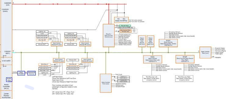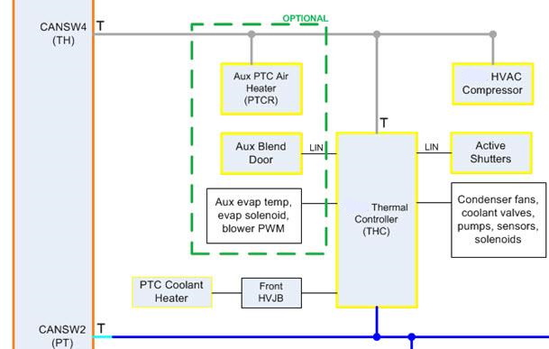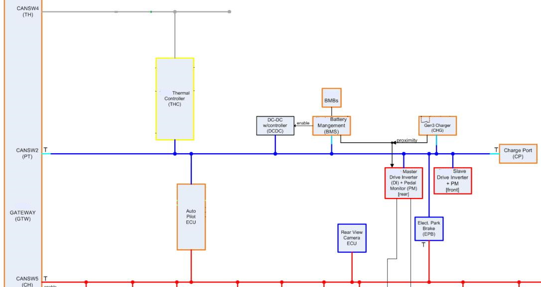 Each controller on the schematic is identified by a colored outline. This indicates whether the controller is supplied with unswitched 12V power and wakes on CAN, or wakes when the HVAC, ACC, or Drive rail turns on.