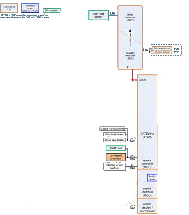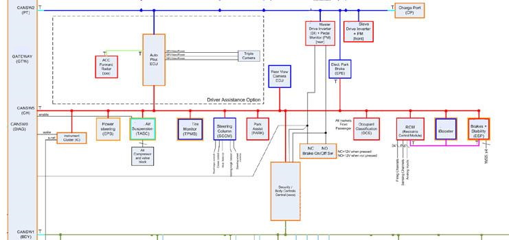 Each controller on the schematic is identified by a colored outline. The outline indicates the controllers power source operation (always powered, ON with Drive Rail, ON with ACC Rail, etc.), along with additional controller wake conditions (e.g. GTW controlled enable).