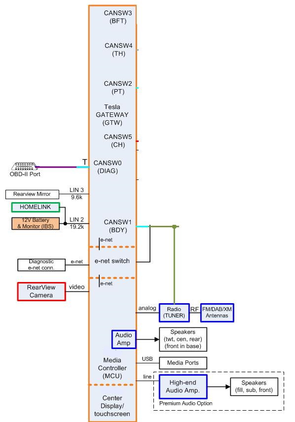 The Tesla media controller section of the GTW has additional connections as detailed in the illustration above.