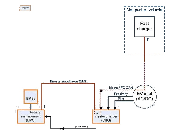 The fast charge CAN has a ‘T’ on 2 nodes. This indicates the 2 terminating nodes of the bus; each adds 120 ohms to the CAN bus. The terminating nodes are located at the end of each bus, to help with the reflection of the messages. A perfectly terminated CAN bus reads 60 ohms, which is the equivalent resistance of the two 120 ohm terminators in parallel.