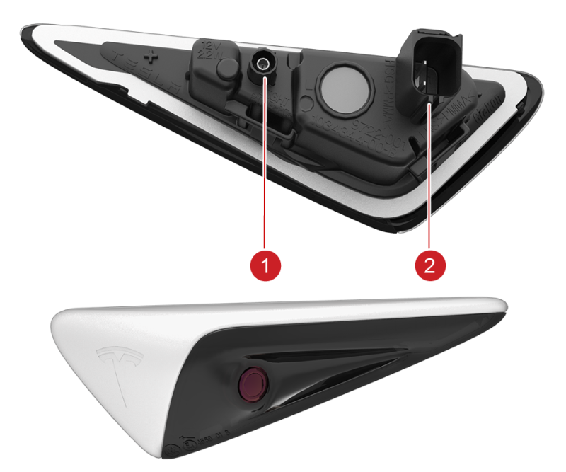 The side repeater lamp assemblies mounted on the front fenders include a camera. These cameras face in a rearward direction and are able to monitor rear blind spots on both sides of the vehicle. Power to the cameras, control of the cameras, and image data from the cameras are provided through the coaxial wiring connected to the Driver Assistance ECU. The connection for the side repeater LED is separate from the camera wiring.