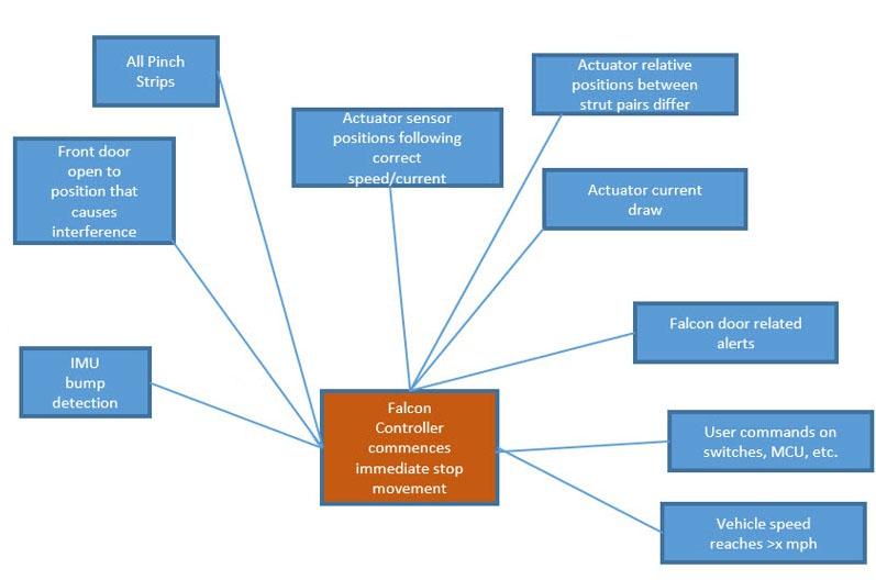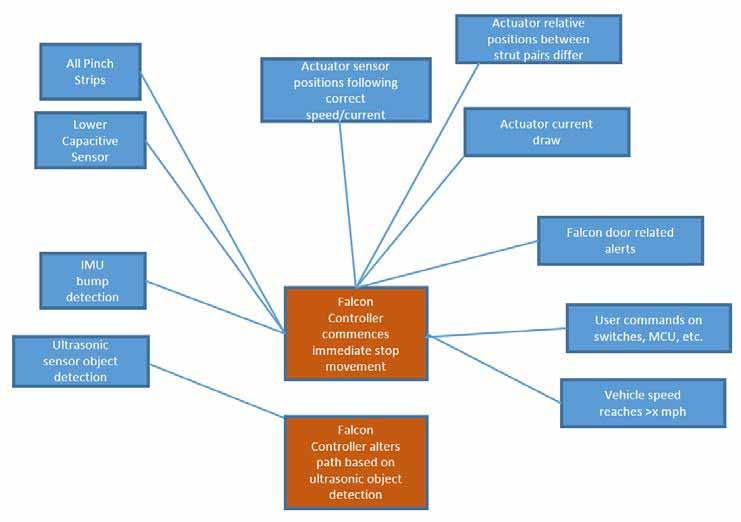 As seen above, conditions are constantly being analyzed during movement and any of them could cause the door to stop movement or alter its path. Ultrasonic and capacitive can detect objects without physical contact during opening and stop the door before contact occurs. In the special case of ultrasonic sensors seeing an object, the trajectory also changes in real time to account for the new environment. This may be useful in some cases to avoid a low object on the side like a box. The IMU in the door controller can also detect bumps via an acceleration change. Nearly all of these cases can also be manually overridden by holding the B-pillar button, which overrides the obstacle detections and drives the struts in the most narrow possible path. If the motion was paused for some reason, another user request will continue the motion to open the door.