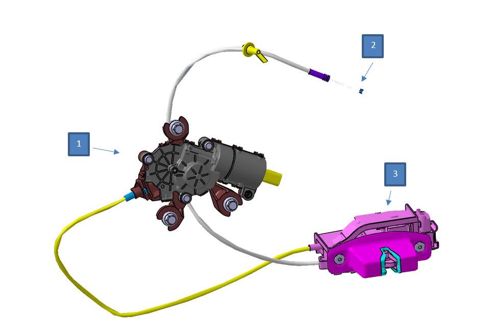 | 1. Latch motor 2. Manual pull cable latch release 3. Latch mechanism |