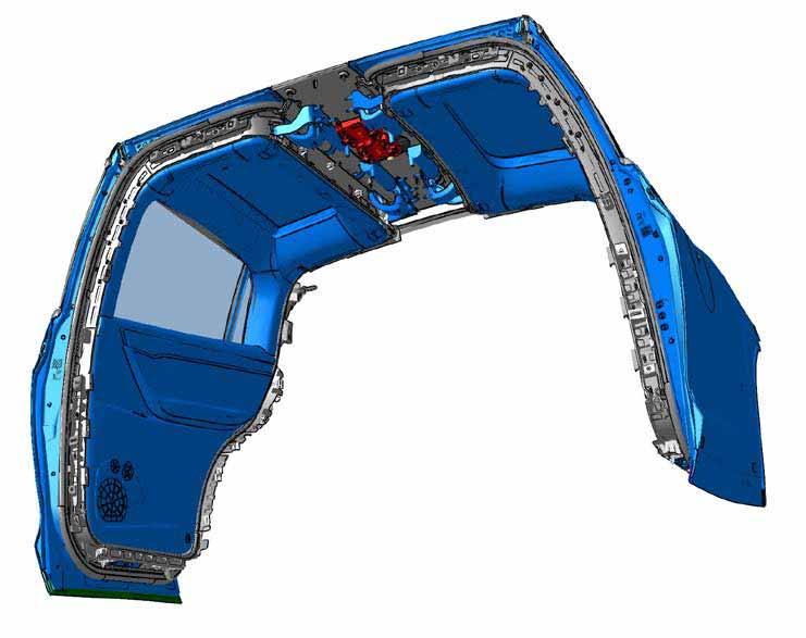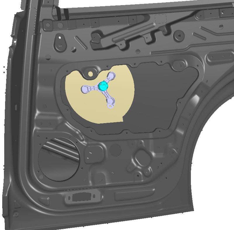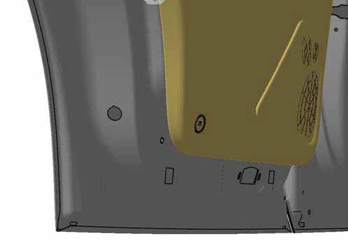 The figure below shows the entire LH rear door as seen from inside the vehicle. The trim pieces shown cover all joints and mask the operation of the door. Most pinch zones are removed, leaving a sleek and stylish door design.