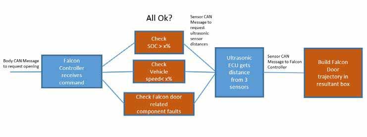 Once the controller determines that the door is safe to open, the rear door electromechanical controller requests the coordinates from the ultrasonic ECU for an immediate map of the surroundings of the vehicle. Once the ultrasonic ECU receives the request, the door and spine ultrasonic sensors build an initial map (box) of space within the surroundings. The 2 dimensions are sent via the sensor CAN bus to the rear door electromechanical controller, where the initial opening trajectory of the door is calculated to fit within that box.