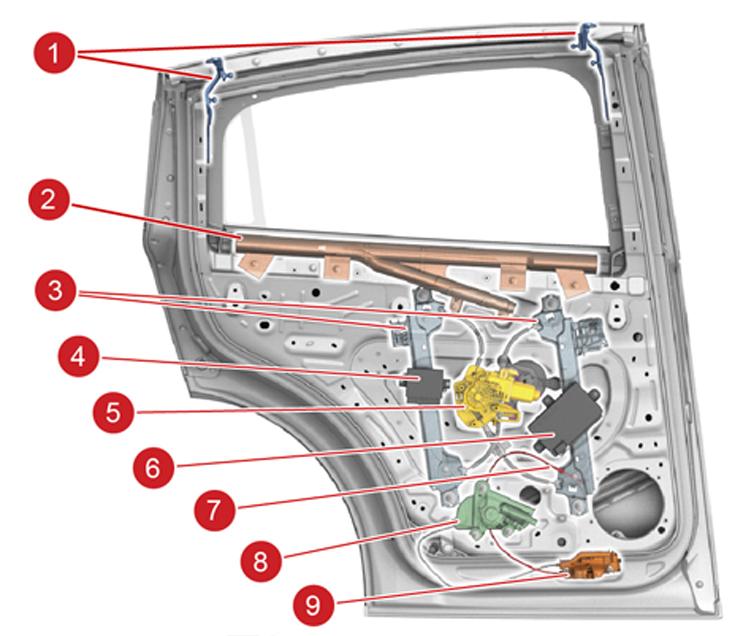| 1. Attachment point from upper door 2. Airbag 3. Window track 4. Ultrasonic ECU 5. Window motor 6. Rear door controller 7. Manual pull cable to release latch and open door 8. Latch motor 9. Latch |