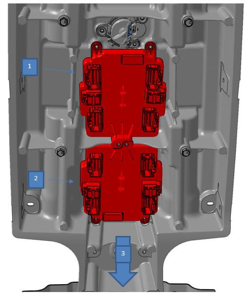 | 1. RH rear door electromechanical controller 2. LH rear door electromechanical controller 3. Front of Vehicle |