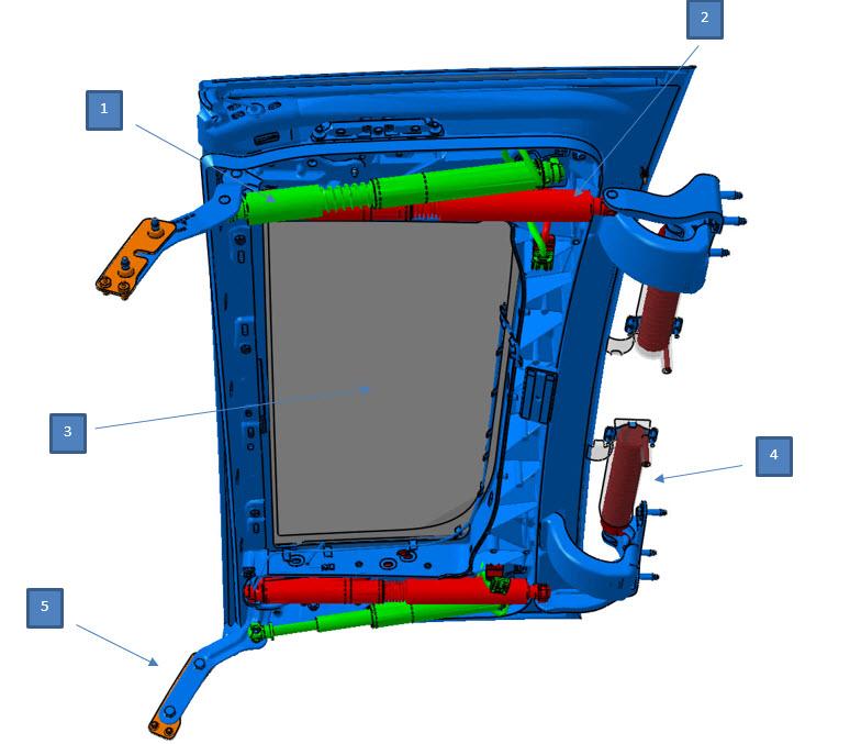 | 1. Lower secondary door struts (green) 2. Upper primary door struts (red) 3. Upper fixed glass 4. Springs 5. Attachment point to lower door |