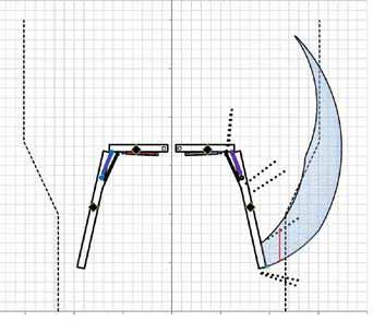 The independent operation of any of the struts allows for a wide range of possibilities for opening and closing profiles. The area of possible openings is shown below. The end tip of the door can be anywhere within the blue area.